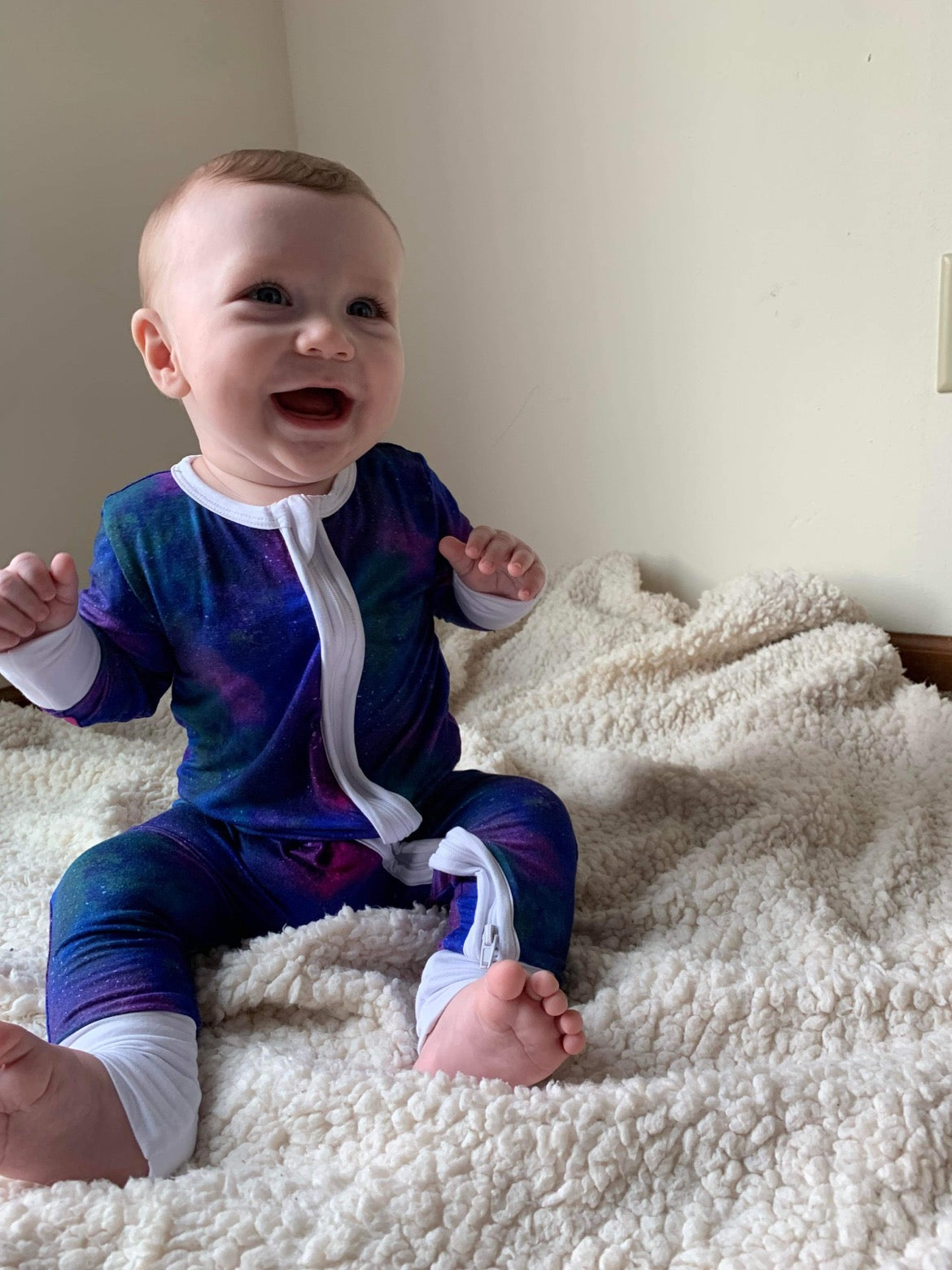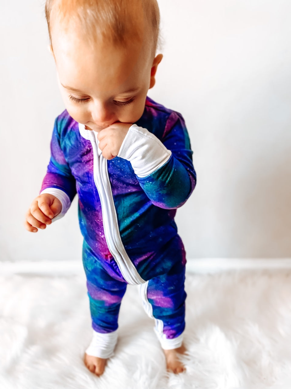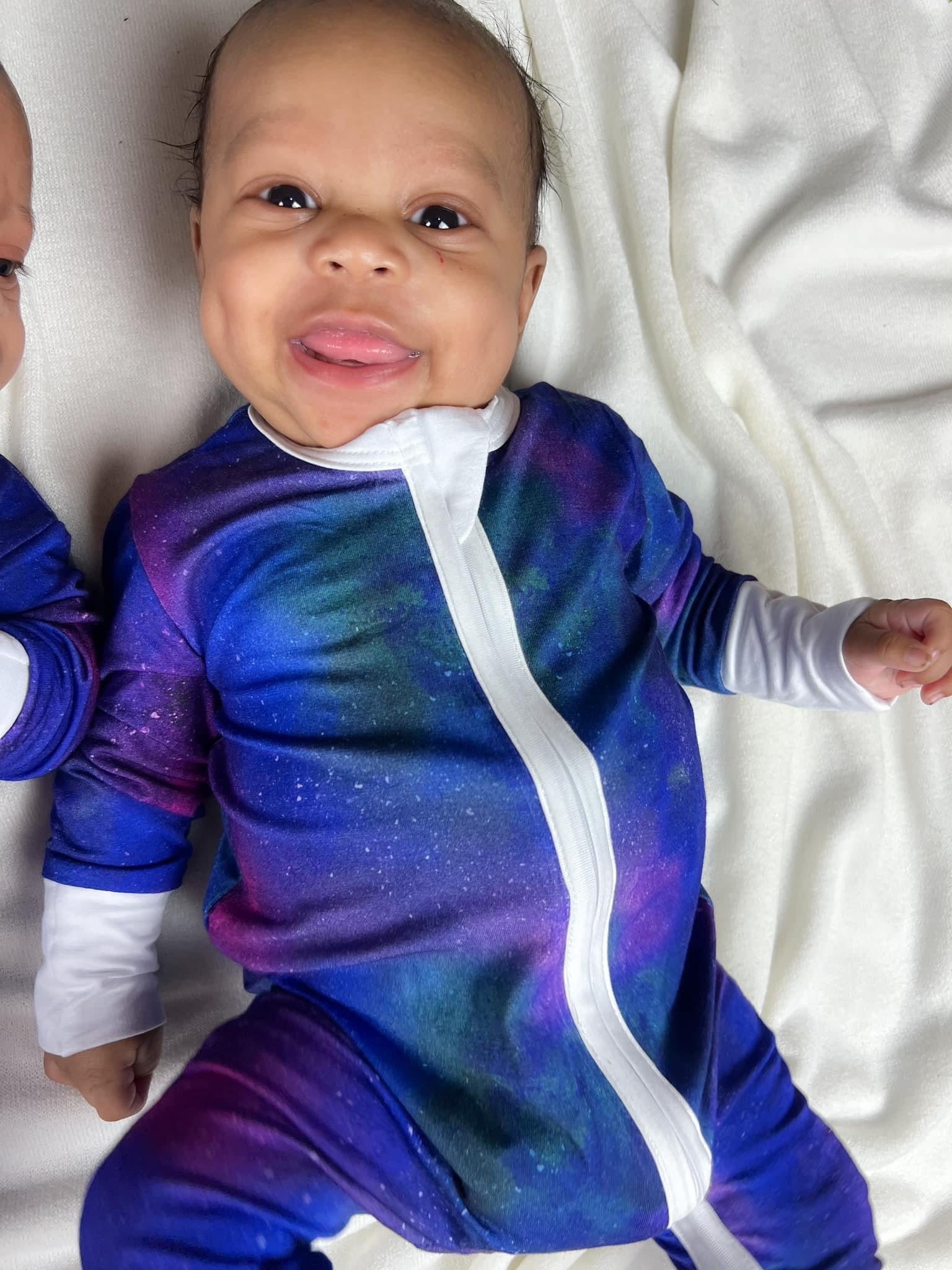 This RTS handmade bamboo viscose romper is perfectly out of this world. Made of the most breathable 95% viscose from bamboo and 5% spandex, it is sure to keep your little one comfortable. The romper is double zipped and has fold over hands and feet for the best comfort and extra wiggle room.